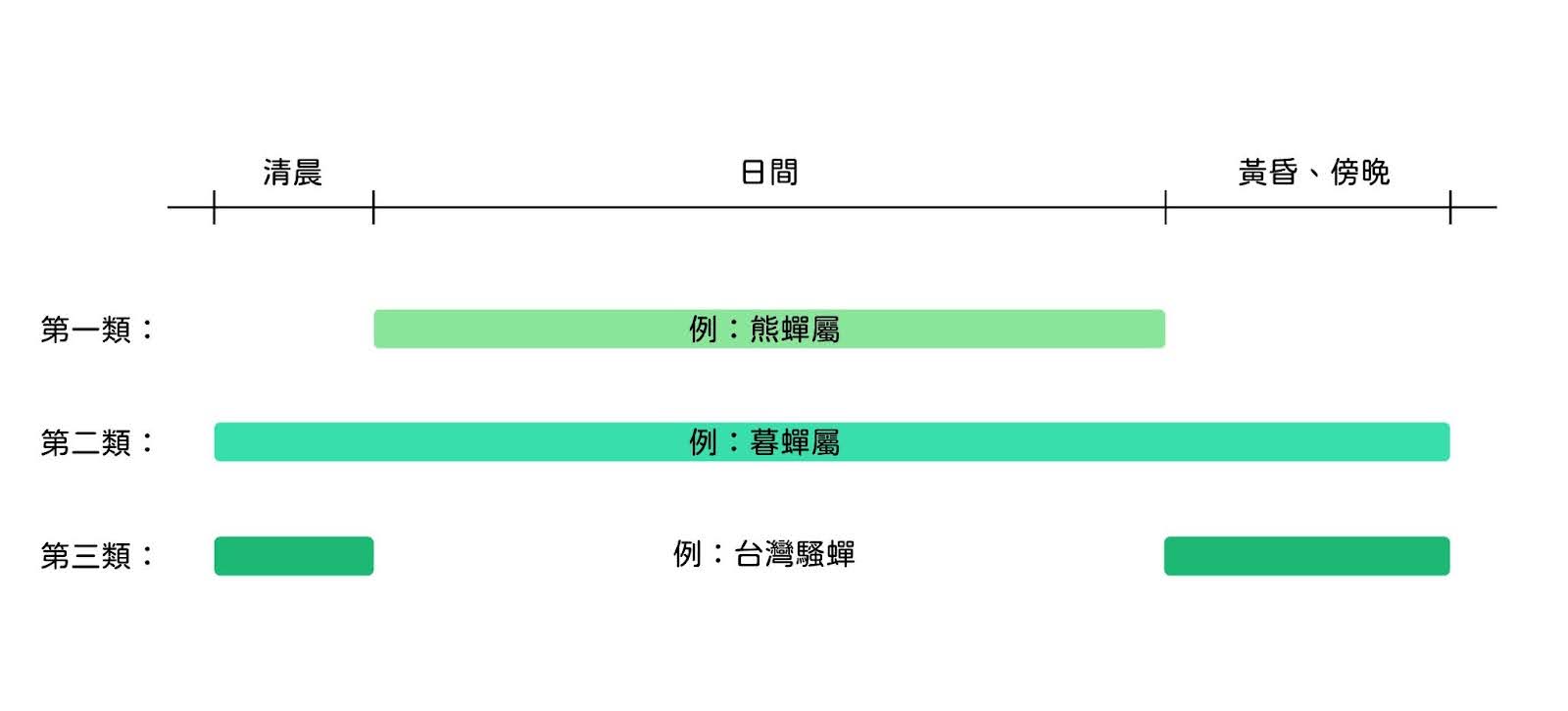 不同的蟬會選擇一天中不同的時段鳴叫。這樣的時間分化有助於物種之間避免彼此干擾,也反映出牠們各自的生理節奏。根據鳴叫時間,可將蟬大致分為三種類型: